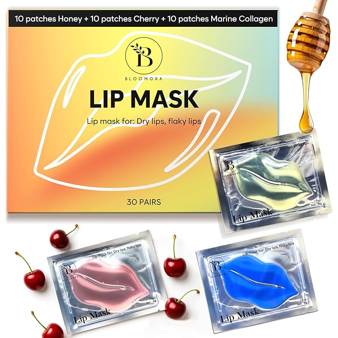 Indulge your lips with this comprehensive collection featuring 10 revitalizing cherry, which deeply hydrating marine collagen, and honey lip masks, ensuring a perfect treatment for every mood and need. Each masks is formulated to address specific concerns- cherry for burst of fruity freshness and benefits, marine collagen for intense plumping and wrinkle reduction, and honey for soothing dry, chapped lips and promoting natural healing. Designed for convenience, each lip mask is individually sealed for hygiene and freshness, making them perfect for on the go hydration, a relaxing self care routine, or as thoughtful gifts.